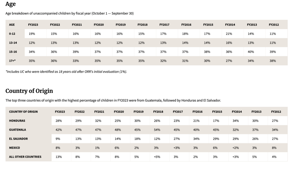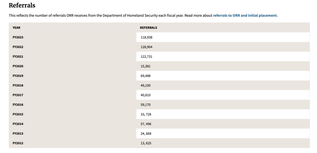 ORR referrals have increased significantly during the Biden administration, no surprise. In 2020 there were 15,381 referrals. In 2021, 2022, and 2023, there were 122,731, 128,904, and 118,938 respectively. 2022 represents a 738 percent increase in referrals over 2020.