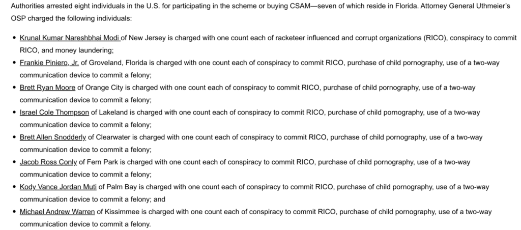 Spanning multiple jurisdictions and countries, the investigation targeted a network accused of producing, distributing, and purchasing child sex abuse material (CSAM) online. The 10-month investigation uncovered over one million videos and images depicting the abuse of minors, including infants, reiterating the scale and depravity of the criminal enterprise. “I can’t tell you in words how gross this content is,” Uthmeier stated during the press conference. “It shows the dangers, the evil that is out there. It is truly evil.”