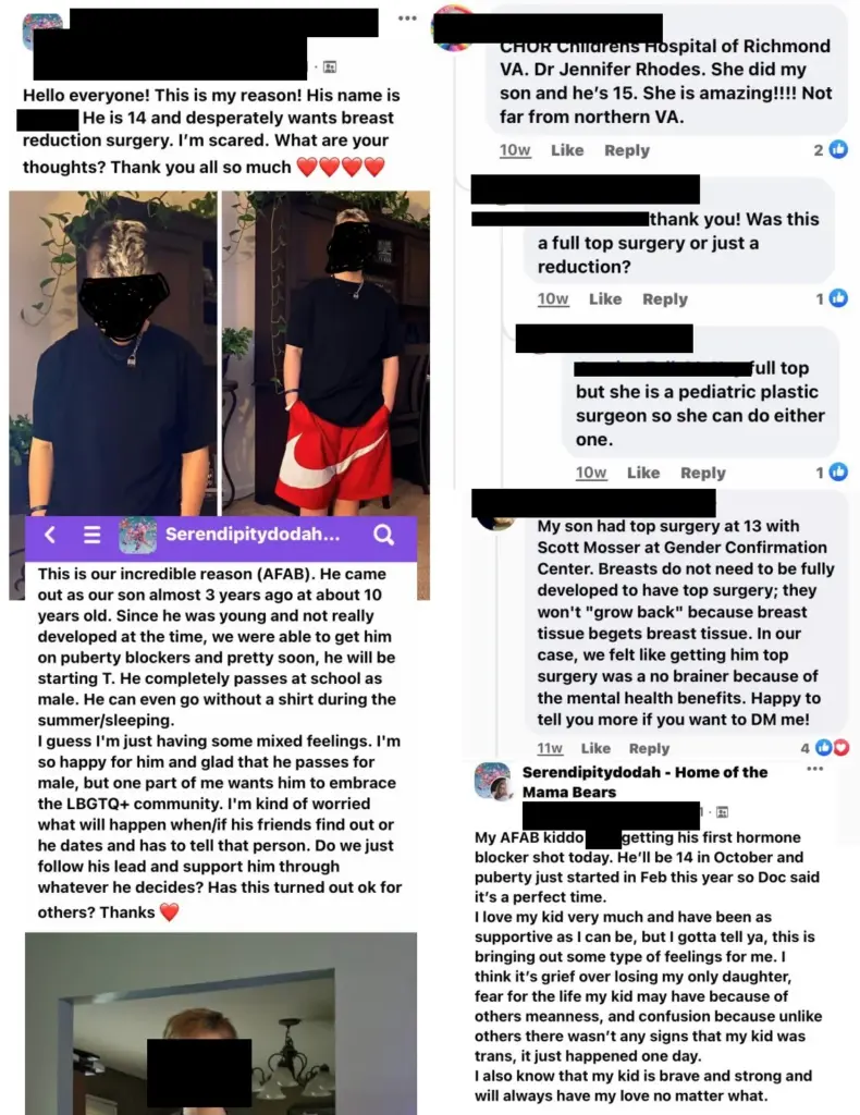 Instead of calculating the harms of allowing children to be experimented on with off label drugs and the irreversible effects of puberty blockers, this Mom group appears to be laser focused on emotional validation while blinded to the very real dangers to their children and their children’s futures. In digging through the feeds dating back years, we couldn’t find any mention of trans regret other than a comment made by the group’s founder referring to trans regret stories being a source of “disinformation”. They don’t compare notes on how or if they talk to their children about the long term side effects including the lifelong dependency on big Pharma. We found few posts addressing the ever present mental health comorbidities or any tips on how to delay these serious medical interventions until they’re adults. They’re laser focused on social, psychological and medical sex changes for kids. They compare notes on how to fast track surgery, how to get insurance to pay for it and they even shared a private list of surgeons willing to perform transition surgeries on children as young as 12! These Mothers proudly share private information about their children’s “journeys” which seem to culminate in posting celebratory pictures of their “reasons” on surgery day. It’s almost as if this marks a kind of baptism into their new identity within this pseudo religion and the death of their old one.