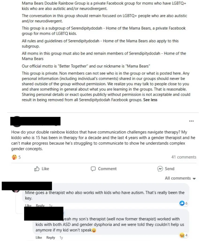 One disturbing trend you quickly notice is the sudden explosion in toddler to grade school aged kids being transitioned along with a clear pattern that shows children with autism being led to believe they’re transgender. They even have a group within the group called “Mama Bears Double Rainbow Group” for Moms who have “LGBTQ+ kids who are also autistic.”