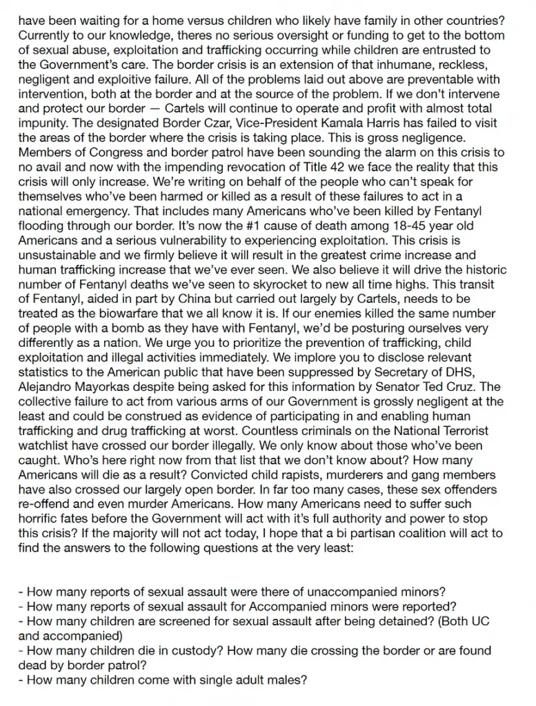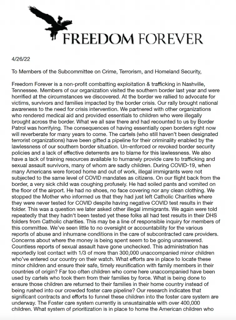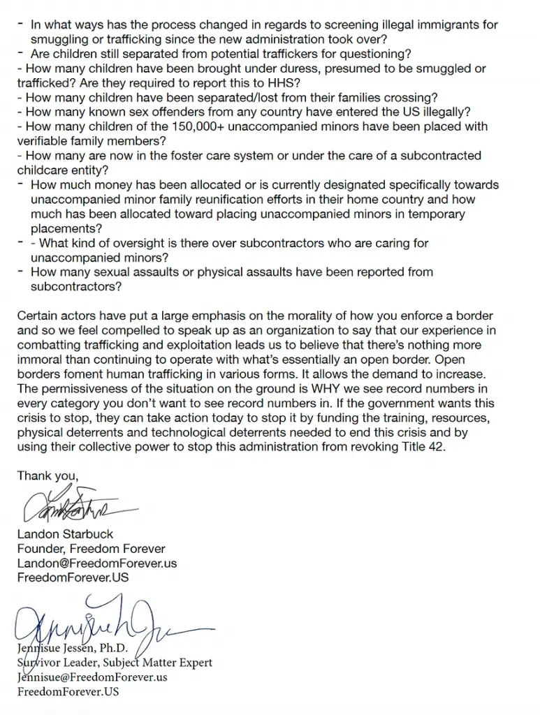 Starbuck and Freedom Forever asked the following questions only to receive no response. Freedom Forever submitted an official advocacy inquiry letter that is now part of Congressional record. The April 26, 2022 letter with questions is pictured below: