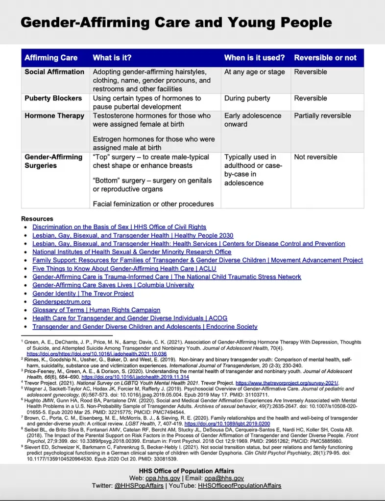 Shamefully, the information about Gender-Affirming Care treatments posted on the HHS website fails to mention the grave harms and irreversible damage hormone replacement can cause in children. It is in no uncertain terms, chemical castration.